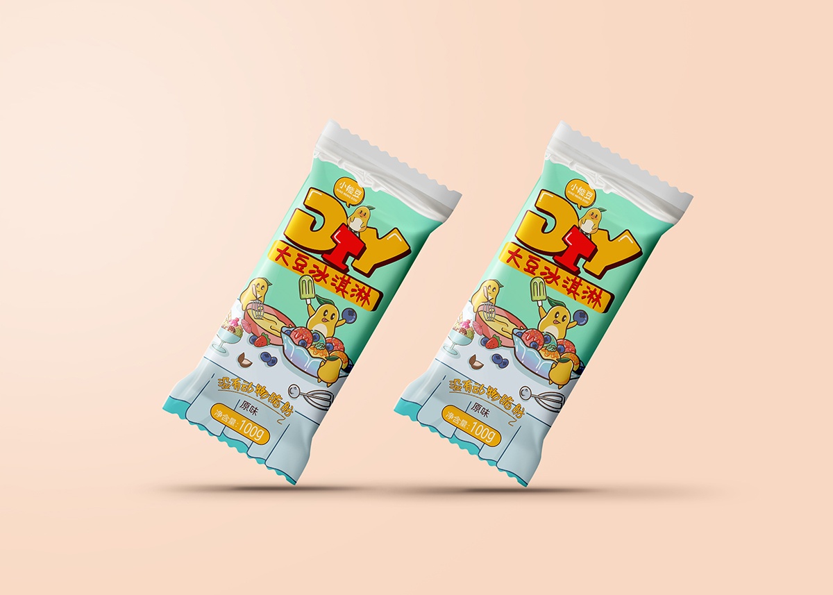 本次快消品包裝設計,包含內包裝袋設計以及外盒設計,整體風格需求要統一,小能豆三個字厚重而不失靈動。這是包裝的重心。DIY大豆冰激凌,則是小精靈隨意涂鴉的精彩紛呈,整體的包裝設計要突出食品行業又要突出DIY的特性。經過初稿及細節修改