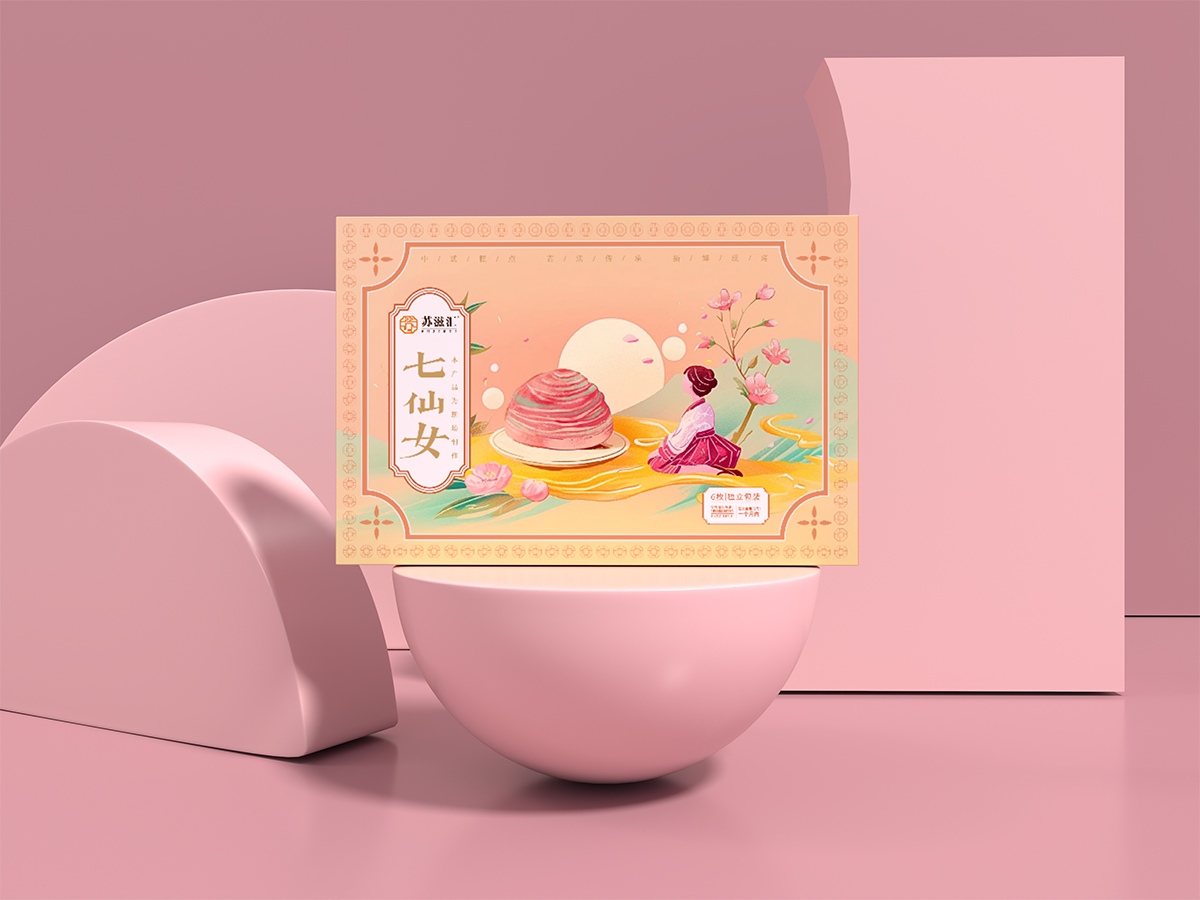 七仙女糕點(diǎn)包裝設(shè)計(jì),以月圓之夜七仙拜月為背景,把玫瑰酥融合其中,通過鮮艷的色彩打造融合的范圍,突出產(chǎn)品賣點(diǎn)。經(jīng)典傳承 手工彩酥,上佳用料,新鮮現(xiàn)制,手工秘制酥皮,薄如蟬翼,上佳用料,成就撲鼻好味道,餡料滿滿,沉浸式蘇式個(gè)糕點(diǎn),霓虹云裳尋至味, 特為人間做好酥。