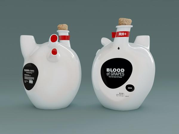 法國BLOOD of GRAPES品牌葡萄酒特色包裝設(shè)計,葡萄酒是葡萄的血液,心臟是它的容器。口號“法國的心臟”支持整個設(shè)計概念。