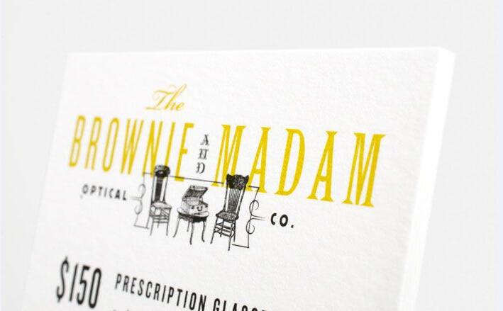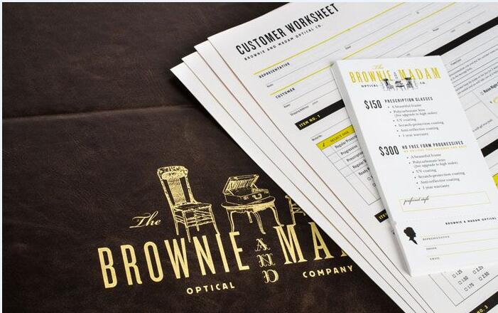布朗尼女士眼鏡公司(The Brownie and Madam Optical Company)正如其名稱所暗示的,企業具有強烈的個性:古怪、叛逆和一絲古色古香。由總部位于舊金山的陳設計協會(CDA)建立全面的品牌形象,帶有十九世紀晚期的美學風格和一些現代風貌。