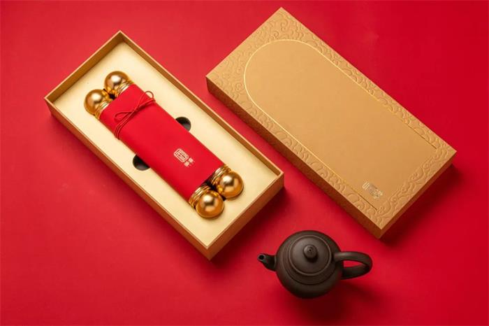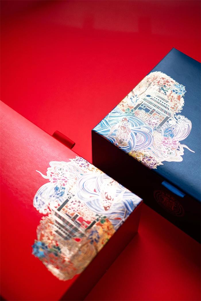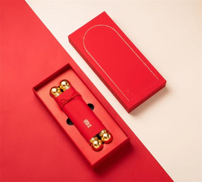 這款御喜茶以國潮風為主視覺,靈感來源于帝王所用物--“御”的敬稱以及圣旨的外觀概念,旨在從深厚的文化底蘊中挖掘經(jīng)典元素,因而紅色包裝的圣旨外觀完成了茶葉的全新形象,另外同色的紅細帶,固定“圣旨”的同時兼顧了美觀性。有意思的是兩端的金屬鏤空軸柄設計,軸端處可扭開半圓,實現(xiàn)擴容的作用,進而能夠合理利用空間。展開后的“圣旨”畫面描繪了宮廷歲月靜好的情景,底襯賦以《奉茶》詩文,拉近與消費者的距離。金色外盒則以線條勾勒了宏偉的宮門形象,兩側繪以祥云深壓紋,一繁一簡,強化視覺張力。