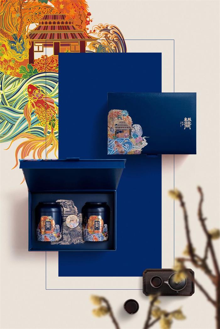 紅、藍兩款包裝彰顯茶葉的端莊大氣,插畫靈感取自中國“鯉魚躍龍門”的傳說故事,鯉魚、龍門及龍的形象刻畫,扁平化設計再現(xiàn)經(jīng)典的場面設定,也象征著勵志向上的設計理念。右側的燙金LOGO的“門”字設計