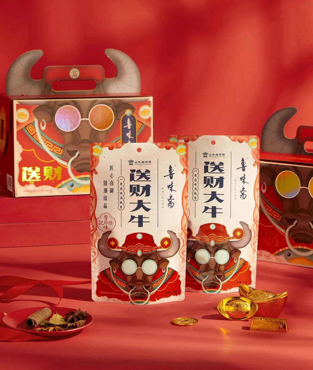 魯味齋是一個山東老字號鹵制品品牌,這款送財大牛禮盒,將牛年與財神結合,賦予了很濃厚的祝福愿景。