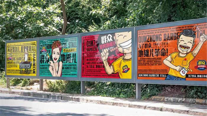 這個(gè)燒烤品牌是基于群眾的定位而進(jìn)行命名的,群眾燒烤地?cái)們,既表明品牌是面向大眾的、百姓的,在價(jià)格上也是親民的,同時(shí)又體現(xiàn)街頭市井文化,突出燒烤品類接地氣的品類屬性。品牌的LOGO標(biāo)志采用了徽章式圖標(biāo),徽章與盾牌符號(hào)相結(jié)合,體現(xiàn)食品的安全性;紅旗飄帶體現(xiàn)革命屬性,也象征著只是一次燒烤改革;群眾二字格外顯眼,強(qiáng)調(diào)品牌的大眾親民,這些元素重新組合,構(gòu)成超級(jí)圖標(biāo)。革命是品牌的主題,“為了群眾,地?cái)們焊锩,是?duì)地?cái)們簾局杏|發(fā)的衛(wèi)生問(wèn)題進(jìn)行的改革,“以前街邊找,現(xiàn)在屋里烤”是革命后的成果,用簡(jiǎn)單直白的話語(yǔ),說(shuō)清品牌的革命方向。將地?cái)們何幕D(zhuǎn)移到室內(nèi),氛圍不能少,基于大眾地?cái)偠ㄎ,以生活中的男孩、女孩、燒烤大叔等市井人物為形象,以及地(cái)們旱膱?chǎng)景運(yùn)用插畫(huà)的形式情景再現(xiàn),還原生動(dòng)有趣的地?cái)們菏⒕。生?dòng)有趣的形象搭配俏皮的地?cái)們悍窖裕磺幸匀罕姙橹行模a(chǎn)品可靠、價(jià)格實(shí)惠,營(yíng)造地?cái)們簾狒[有趣的氛圍。用半寫(xiě)實(shí)的表現(xiàn)手法來(lái)呈現(xiàn)地?cái)們寒a(chǎn)品,虛實(shí)之間,盡是對(duì)地?cái)們簾疚幕南矏?ài)和重視。