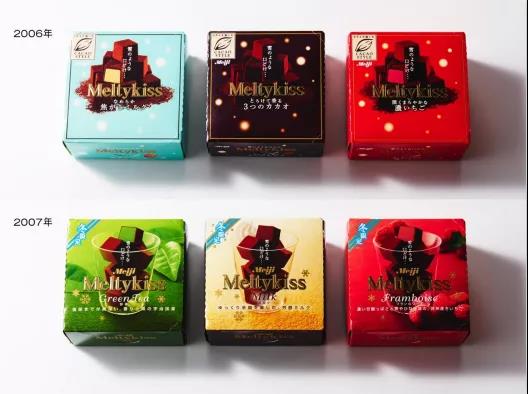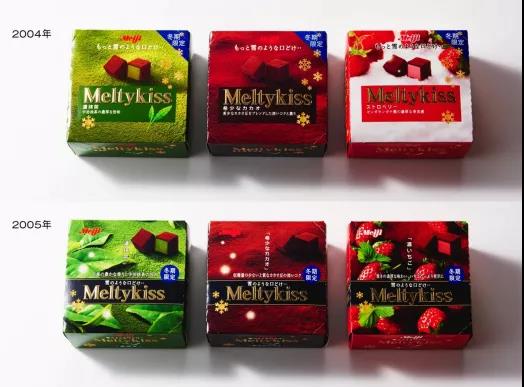 在其2004-2005年的包裝上,可以看到兩顆巧克力擺放在一起,背景是代表口味的可可粉、抹茶粉。這個設(shè)計想表達(dá)的是,兩顆巧克力就像一對情人在雪地上相互依偎,草莓口味包裝上白色的背景就像一片雪地。以戀人、雪地的比喻呼應(yīng)品牌名,營造一種浪漫的氛圍。