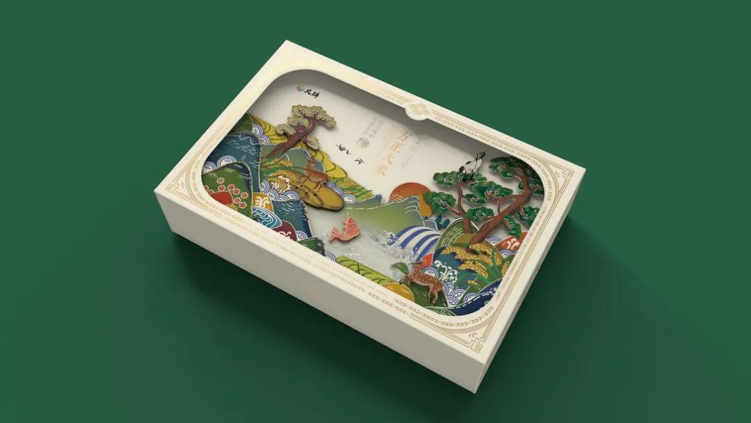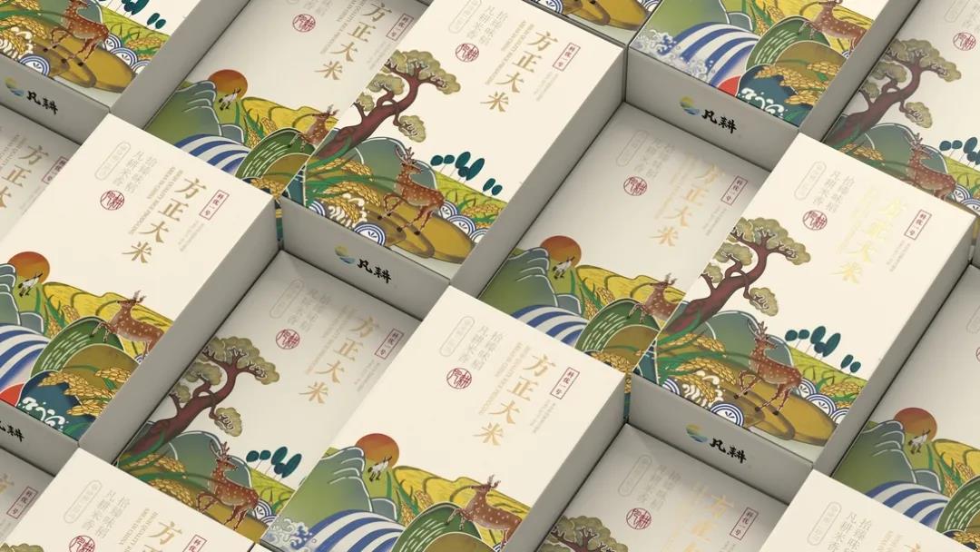 產(chǎn)自東北優(yōu)質(zhì)種植區(qū)域的凡耕大米,以“順應(yīng)自然規(guī)律”為理念,憑借四季分明、雨水充足的自然條件,培育出天然、健康、優(yōu)良的品質(zhì)大米。首先外盒采用鏤空式設(shè)計,提取東方設(shè)計美學(xué)中常見的花紋元素,金色描邊更顯禮盒包裝的貴氣、優(yōu)雅,讓消費者有種仿佛正在欣賞優(yōu)秀畫作的感覺,增強整體包裝的立體感。插畫風的設(shè)計延續(xù)中國傳統(tǒng)美學(xué)底蘊,畫面融入了江河、田野、高山、野鹿等元素,低飽和度色調(diào)的運用營造溫馨的氛圍,日落西方的場景描繪結(jié)合米白色調(diào),更能讓人沉浸其中。